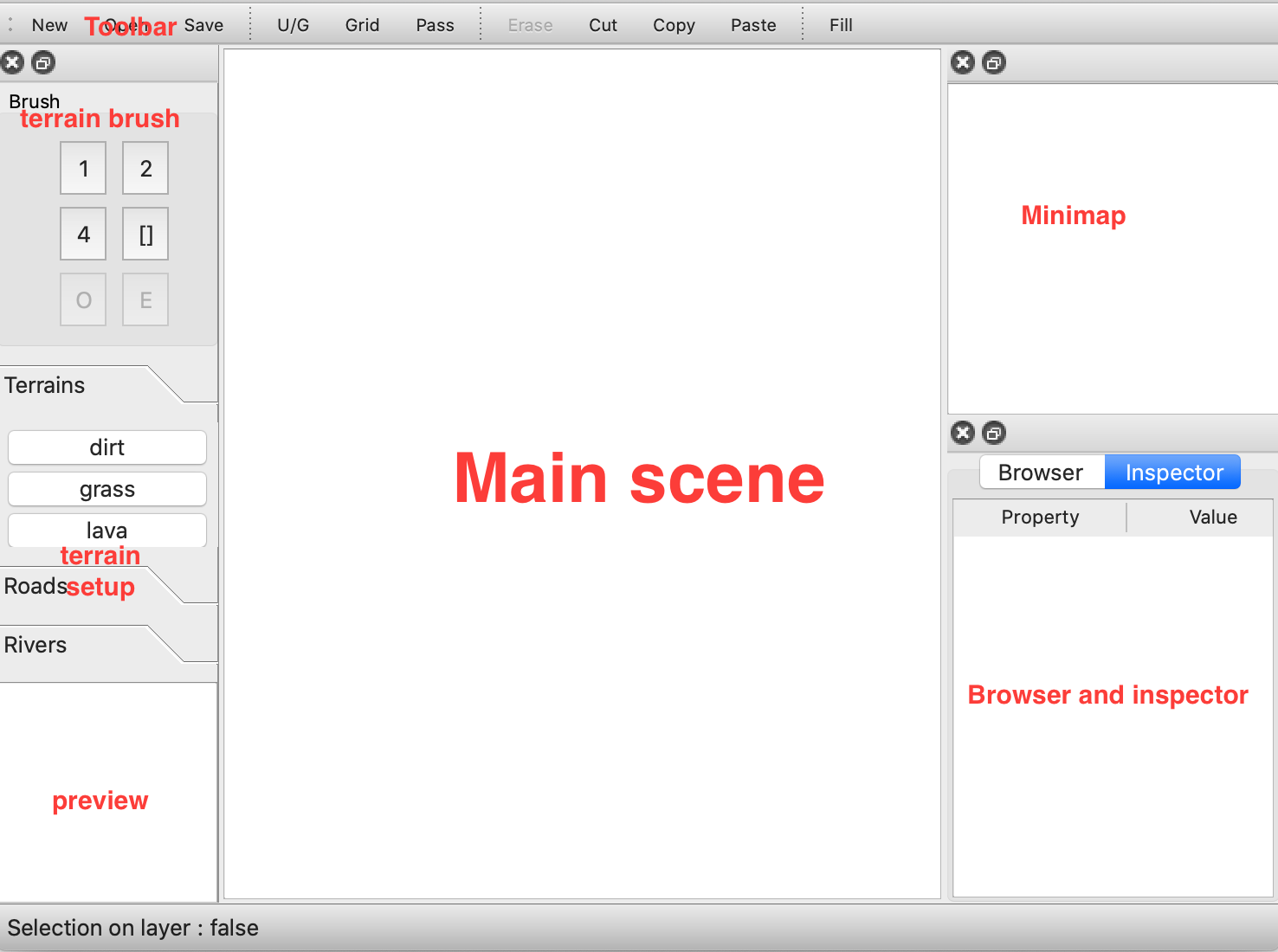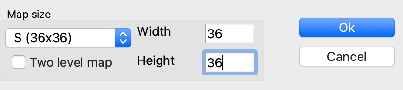 To create empty map, define its size by choosing option from drop-down list or enter required size manually in the text fields and press Ok button. Check Two level map option to create map with underground.