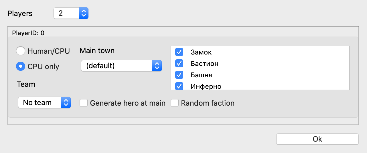 You will see a window with player settings. Combobox players defines amount of players on the map. To review settings for particular player scroll the internal window. There are bunch on settings for each player you can change.