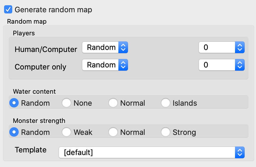 To generate random map, check the Random map option and configure map parameters. You can select template from the drop-down list.