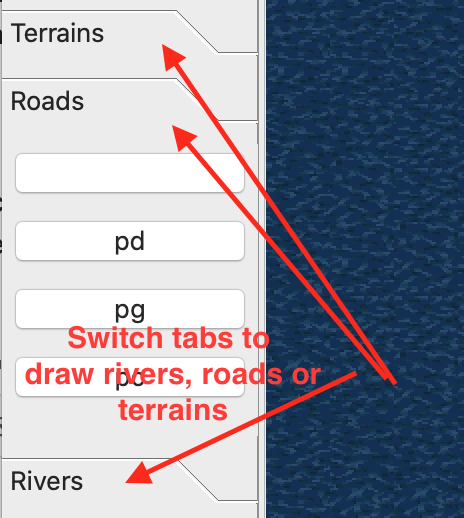 Actually, the process to draw rivers or roads is exactly the same as for terrains. You need to select tiles and then choose road/river type from the panel.